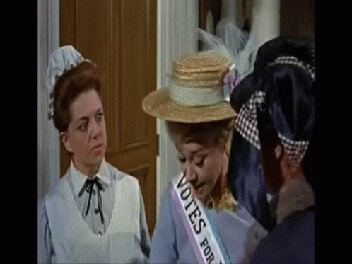 Mary Poppins, wearing a 'Votes For Women' sash, passionately speaks to another woman.