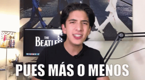 Andres Neshudo expresses uncertainty, saying "Pues más o menos" in front of a Beatles poster.