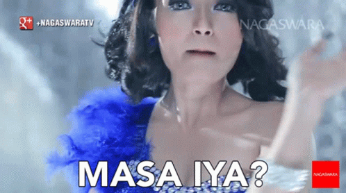 Siti Badriah in a blue dress, looking confused and asking 'Masa Iya?' in her music video.