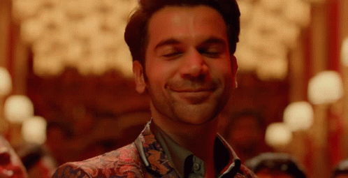 Rajkummar Rao smiles with his eyes closed, wearing a stylish floral suit in a warm-toned setting.