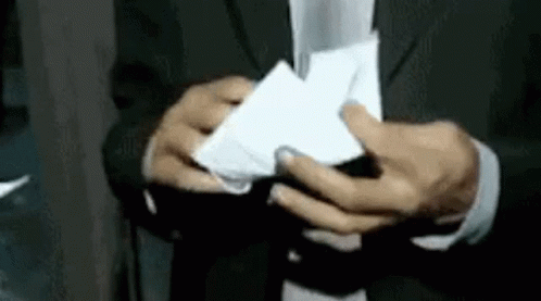 A man in a suit attempts to create and wear a makeshift mask out of a piece of paper, struggling with the process.