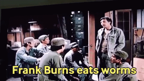 A scene from MASH 4077 featuring Hawkeye Pierce and other soldiers, with the text 'Frank Burns eats worms' on screen.