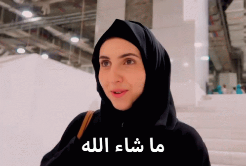 Woman in black hijab expresses 'Ma sha Allah' in a grand setting.