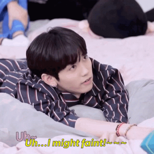 K-pop idol Mashiho, also known as Takata Mashiho, lies on a bed, exclaiming 'Uh... I might faint!'