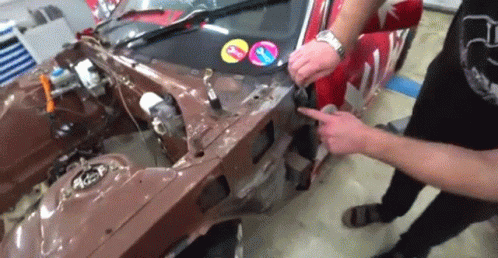Sergey Stilov working on a car's front fender in a garage, pointing at the chassis.