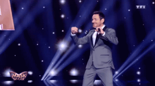 Combal dances energetically on stage in a suit during a performance on the French TV show Mask Singer.