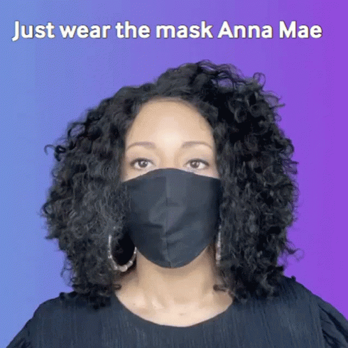 Holly Logan, with curly hair, wears a black mask as text 'Just wear the mask Anna Mae' appears.