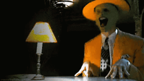 The Mask character reacts with extreme delight, his eyes comically popping out of his head.