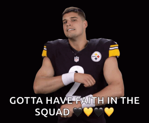 Mason Rudolph, wearing his Steelers jersey, confidently states, 'Gotta have faith in the squad'.