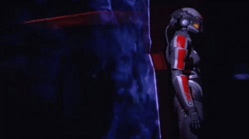 Shepard, a character from the Mass Effect video game, standing in futuristic armor.