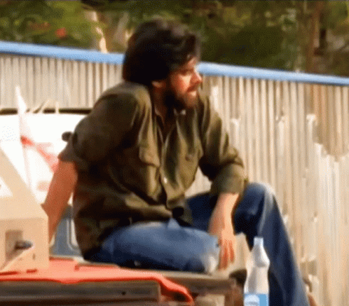 Pawan Kalyan, the Power Star, sits and adjusts his hair and glasses in a candid moment.