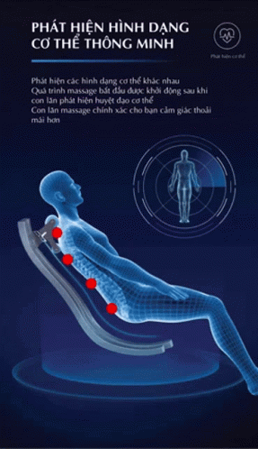 An animated demonstration of a smart massage chair with body shape and acupoint detection for a comfortable experience.