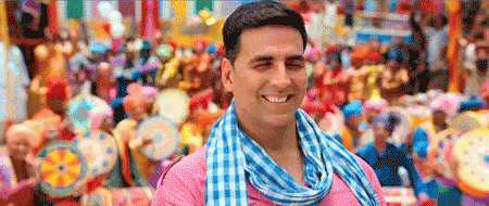 Akshay Kumar smiles brightly in a pink shirt and blue scarf amidst a vibrant, festive crowd.