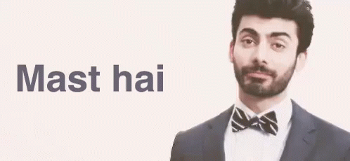Fawad Khan smiling with the phrase 'Mast hai' (It's awesome) displayed, wearing a suit and bow tie.