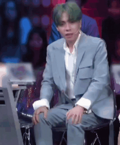 Masterd Quang Hung, with green hair, claps enthusiastically while seated on a stage.