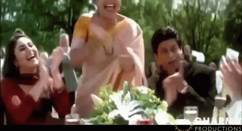 Kajol and Shah Rukh Khan share a joyful moment, clapping and laughing in a scene from the Bollywood movie Kabhi Khushi Kabhie Gham.