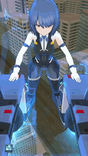 Matoba Aoi from Alice Gear Aegis performs dynamic actions, pouring champagne and flying through a futuristic city.