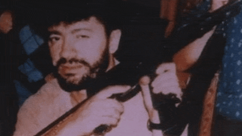 Matoub Lounes, the Algerian singer and activist, holding a gun with the caption 'It's time to kill him now'.