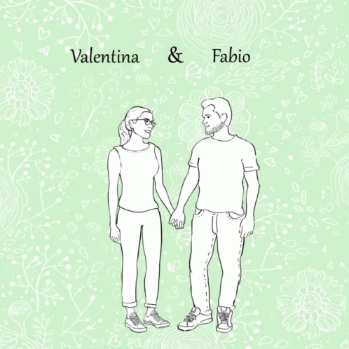 Valentina and Fabio's wedding invitation, featuring a charming animated drawing of the couple on their special day.