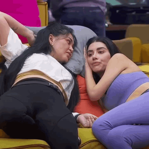 Karime Pindter and a friend from Matrioshka Team Mar relaxing on a yellow couch, engaged in conversation.