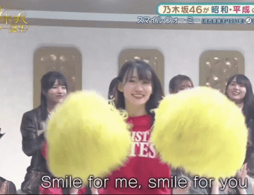 Matsuo Miyu (Miyurin) from Nogizaka46 smiles and cheers with yellow pom-poms during a performance.