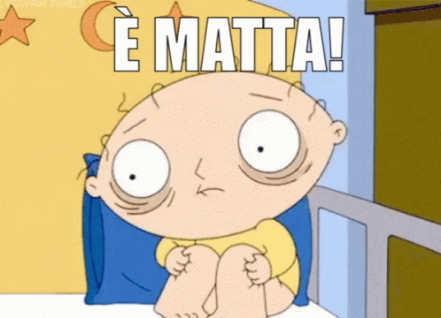 Stewie Griffin from Family Guy looks shocked with the Italian caption 'È Matta!' (She's crazy!).