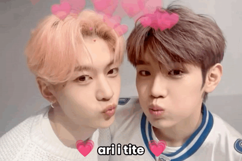ZB1 members Matthew (Seok Matthew) and Kim Taerae pose with puckered lips, surrounded by heart emojis.