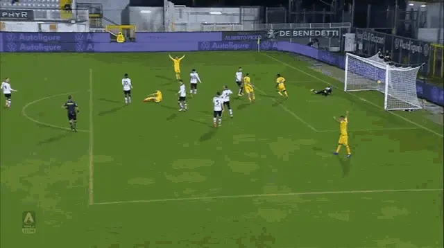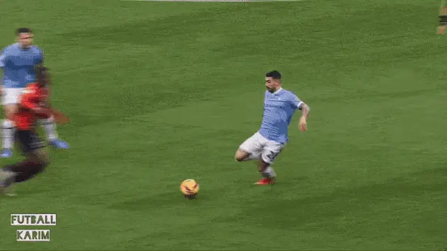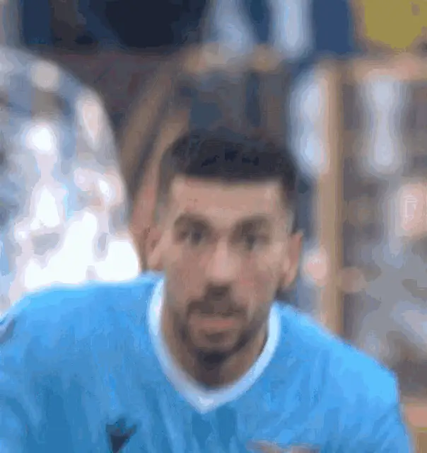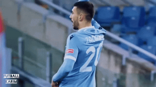 Mattia Zaccagni celebrates a goal with his signature archer pose in his light blue jersey.
