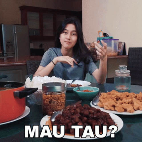 Keisya Levronka enjoying a meal with various Indonesian dishes, asking "Mau Tahu?".