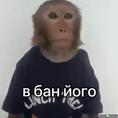 A monkey in a blue 'Lunch Time' shirt makes a gesture, with the text 'ban him' overlaid on the video.