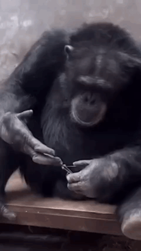 A chimpanzee is sitting on a wooden bench, carefully handling a pair of scissors in its hands.