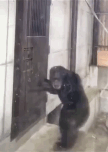 A chimpanzee attempts to open a door and then climbs through a small opening.