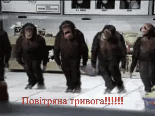 Monkeys quickly climb into a building's windows and openings, seeking shelter during an air raid alert.