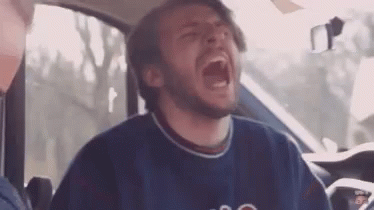 Maxenss intensely screaming with his mouth wide open while sitting in the driver's seat of a car.