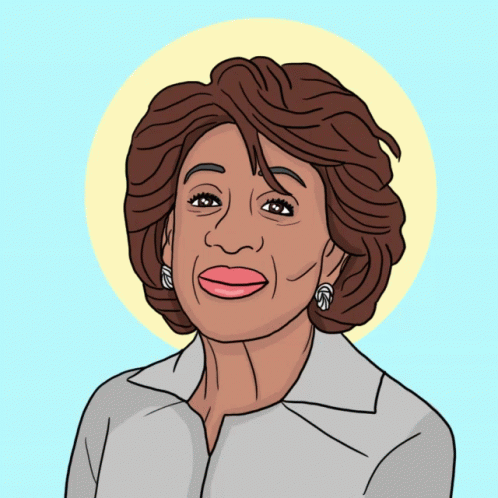 A cartoon drawing of Maxine Waters with a classic eyeroll expression, featuring a halo and sparkling stars.