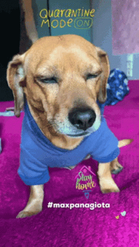 Maxpanagiota, a cute dachshund, wears a blue sweater with "Quarantine Mode On" and encourages staying home.