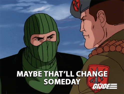 Beachhead and Flint from G.I. Joe in a classic animated scene, with the memorable quote 'Maybe That'll Change Someday'.
