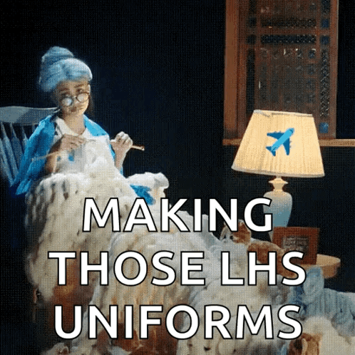 Maymayentrata diligently knitting LHS uniforms, surrounded by a pile of white yarn and finished garments in a cozy setting.