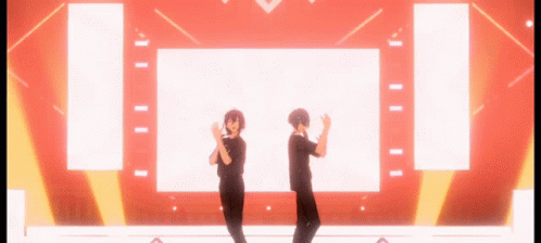 Mayoi Ayase and Niki Shiina perform a dynamic dance on a vibrant stage with changing lights.