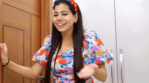 a woman in a colorful floral dress is standing in front of a door and smiling .