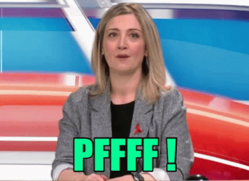 Emilie Mazoyer, a woman in a gray jacket, reacts with a humorous 'PFFFF!' on a TV set.