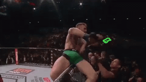 Conor McGregor in green shorts, fighting in a UFC wrestling ring, making it rain money after a win.