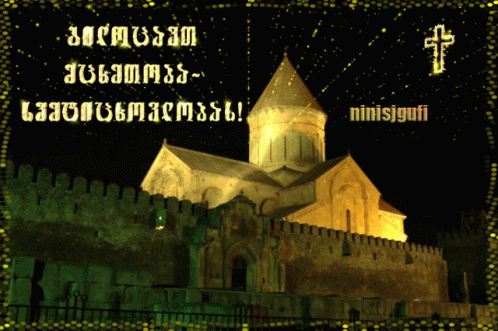 Svetitskhoveli Cathedral illuminated at night, celebrating Mtskhetoba-Svetitskhovloba, with a festive message.