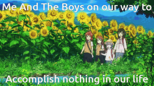 Anime characters Hotaru, Renge, and Koshigaya in a 'Me And The Boys' meme, walking through various seasons.