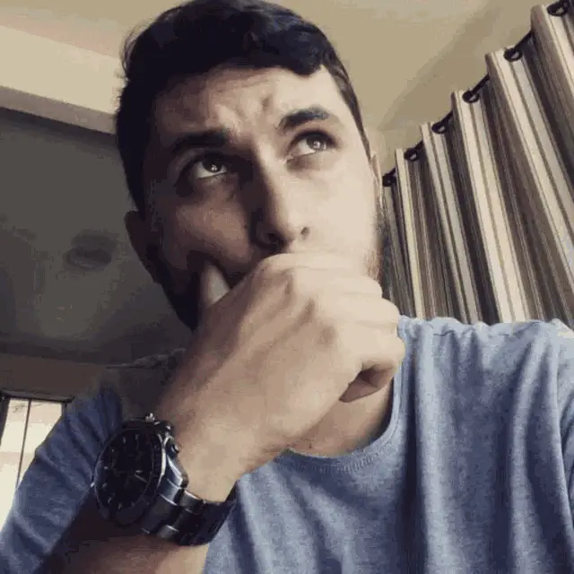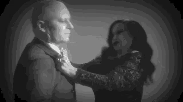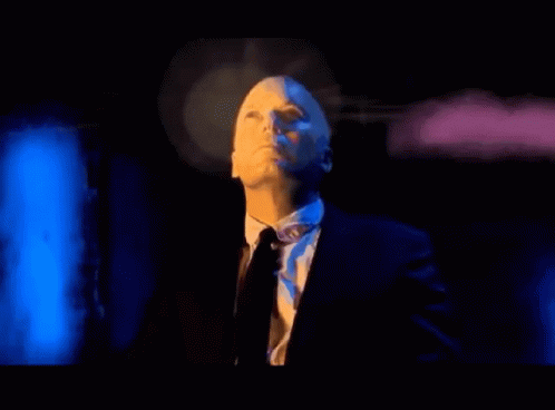 A bald man in a suit holds his head, appearing to be in pain or deep thought, under dramatic blue and pink lighting.