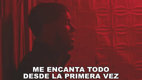 Anuel Aa in a dark, red-lit room with the text 'Me Encanta Todo Desde La Primera Vez' displayed.