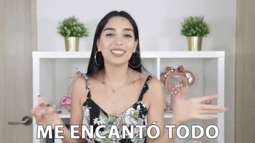 Claudipia excitedly exclaims 'Me Encantó Todo' (I Loved Everything) in front of a white shelf.