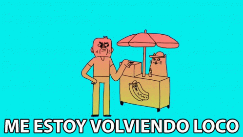 A cartoon man next to a hot dog stand, exclaiming 'I'm going crazy' with a cat walking by.