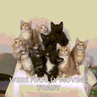 A large group of adorable kittens of various colors are piled on a chair, looking intently forward. A relatable 'Me Rn' moment.
