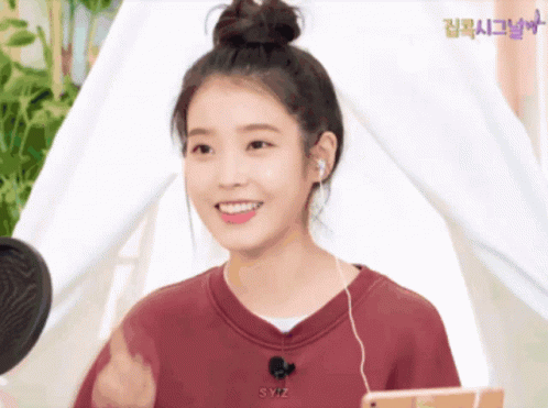 IU (Lee Ji Eun) smiles and points, wearing a red sweatshirt, with the caption 'Me too!!'.